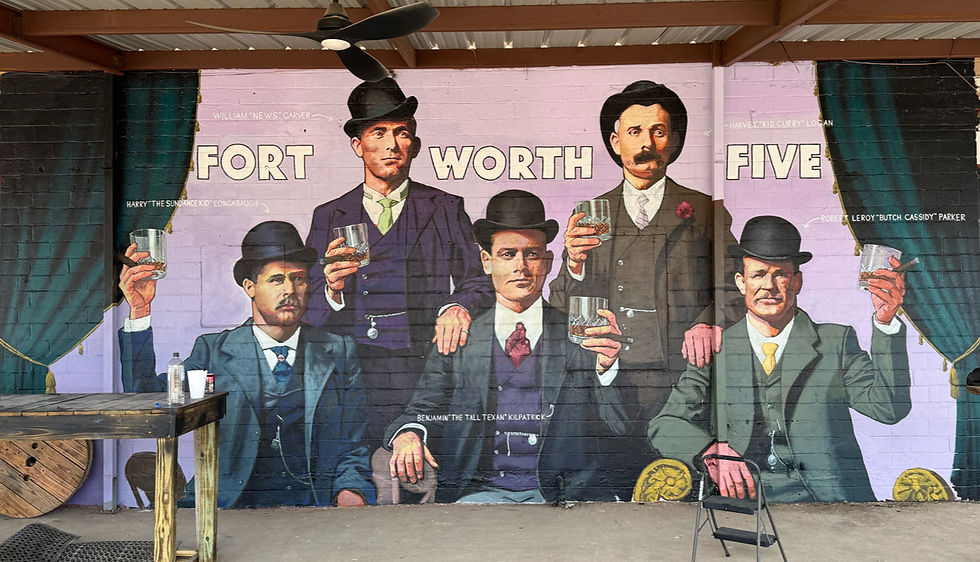 This mural was commissioned by the owners of Hell's Half Acre Saloon in the Stockyards area of Fort Worth and is a contemporary reimagining of famous image of the Fort Worth Five. In our version they are celebrating with whiskey and cigars. the mural is on the patio and over looks Main st.